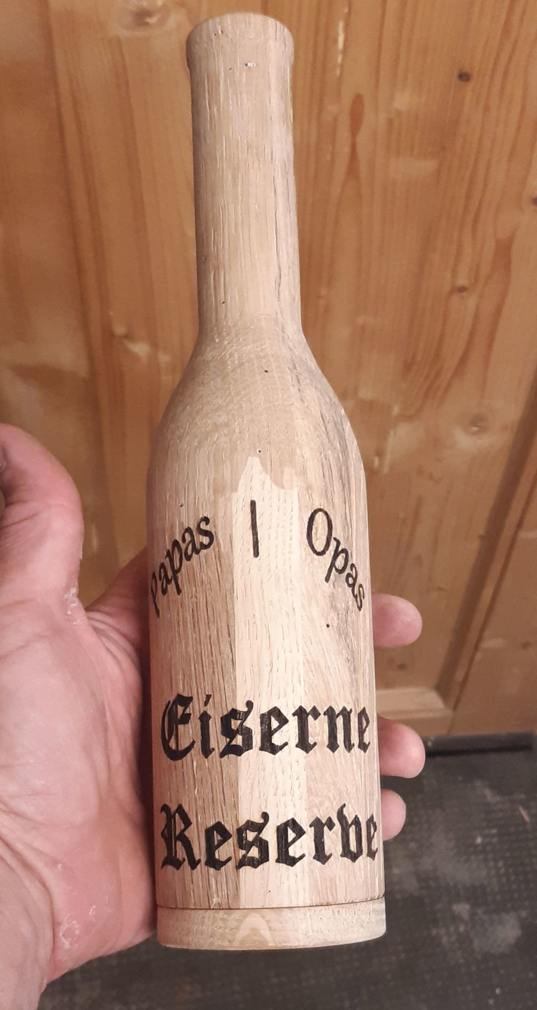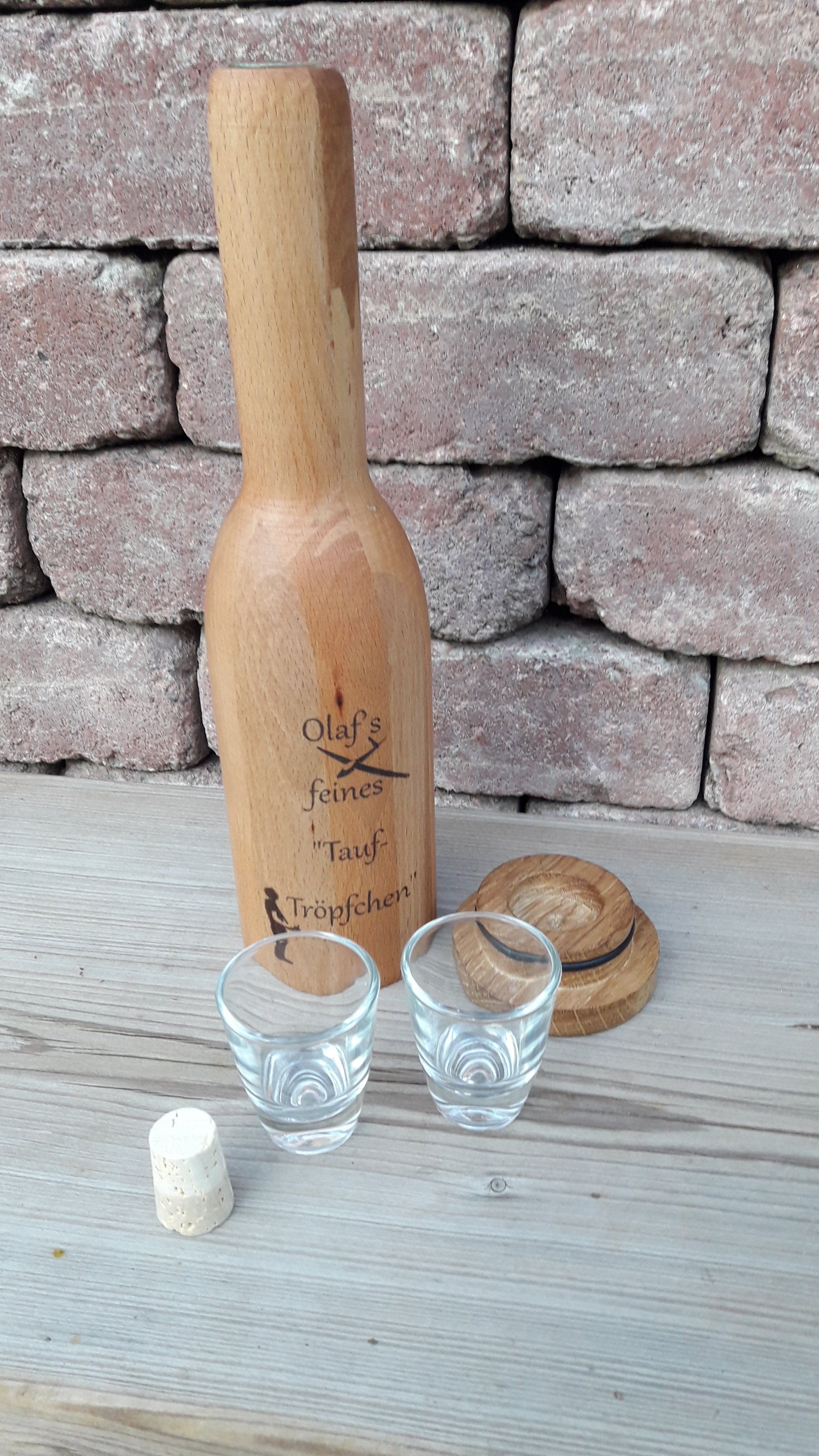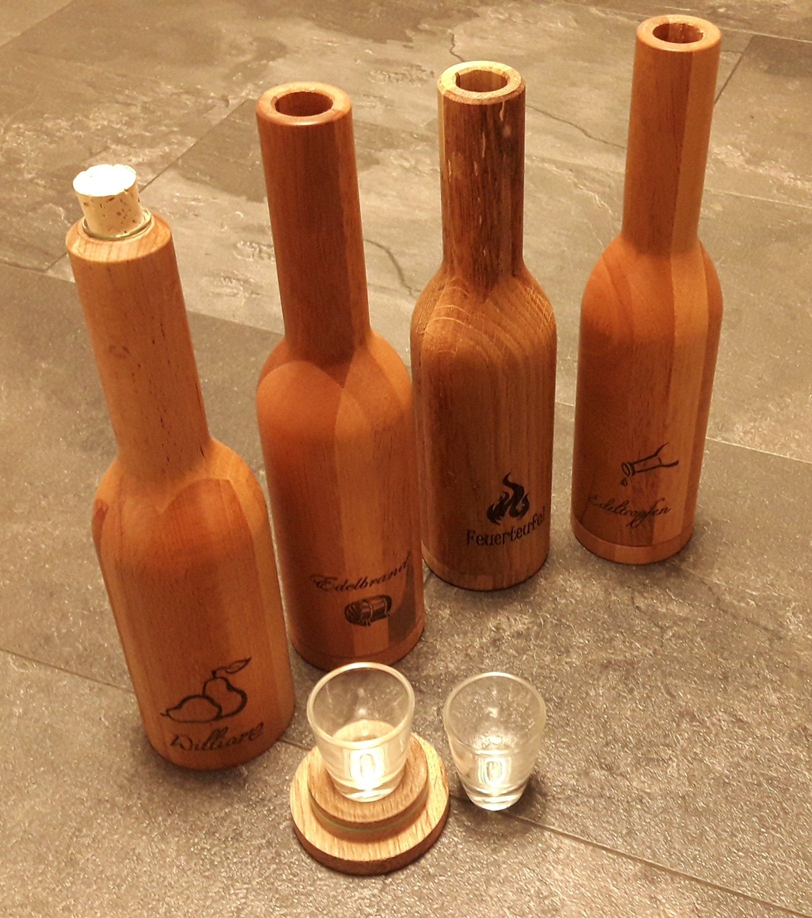 Die Holzflasche besteht aus dem hölzernen Körper und einem verschließbaren Glaskörper. Im abnehmbaren Flaschenboden befinden sich zwei Schnapsgläser.
