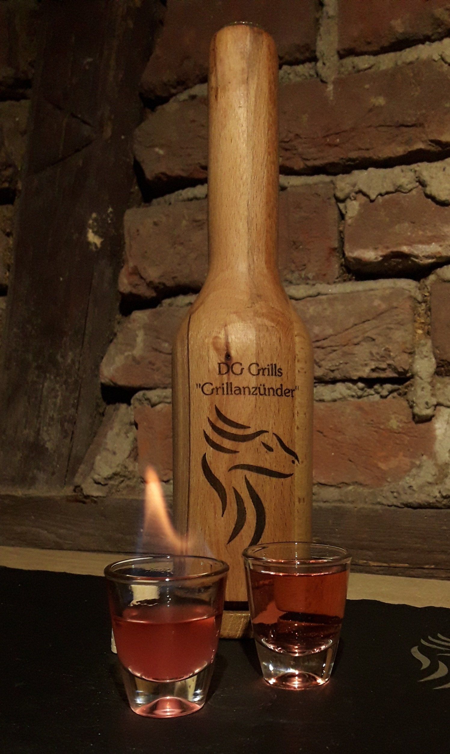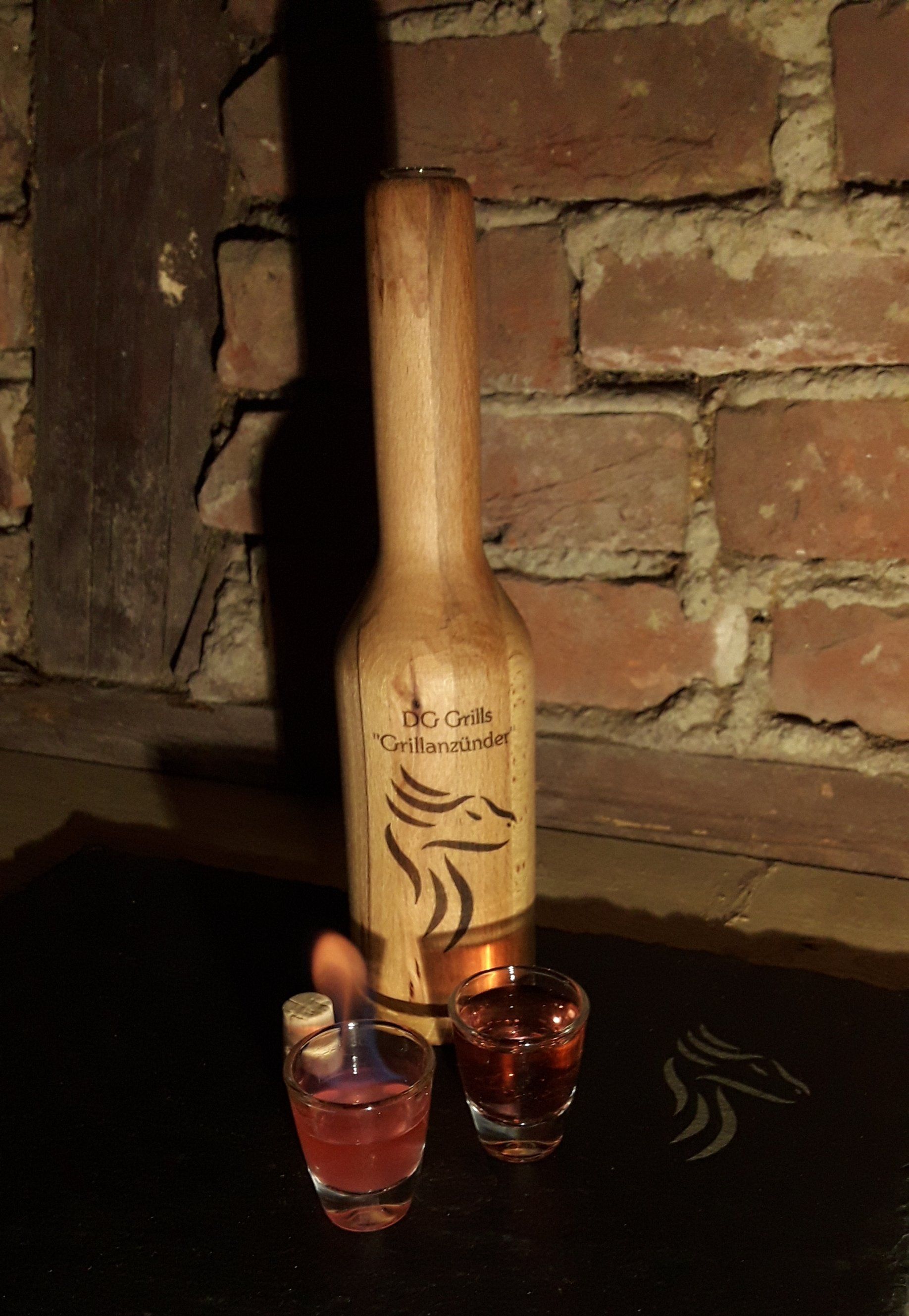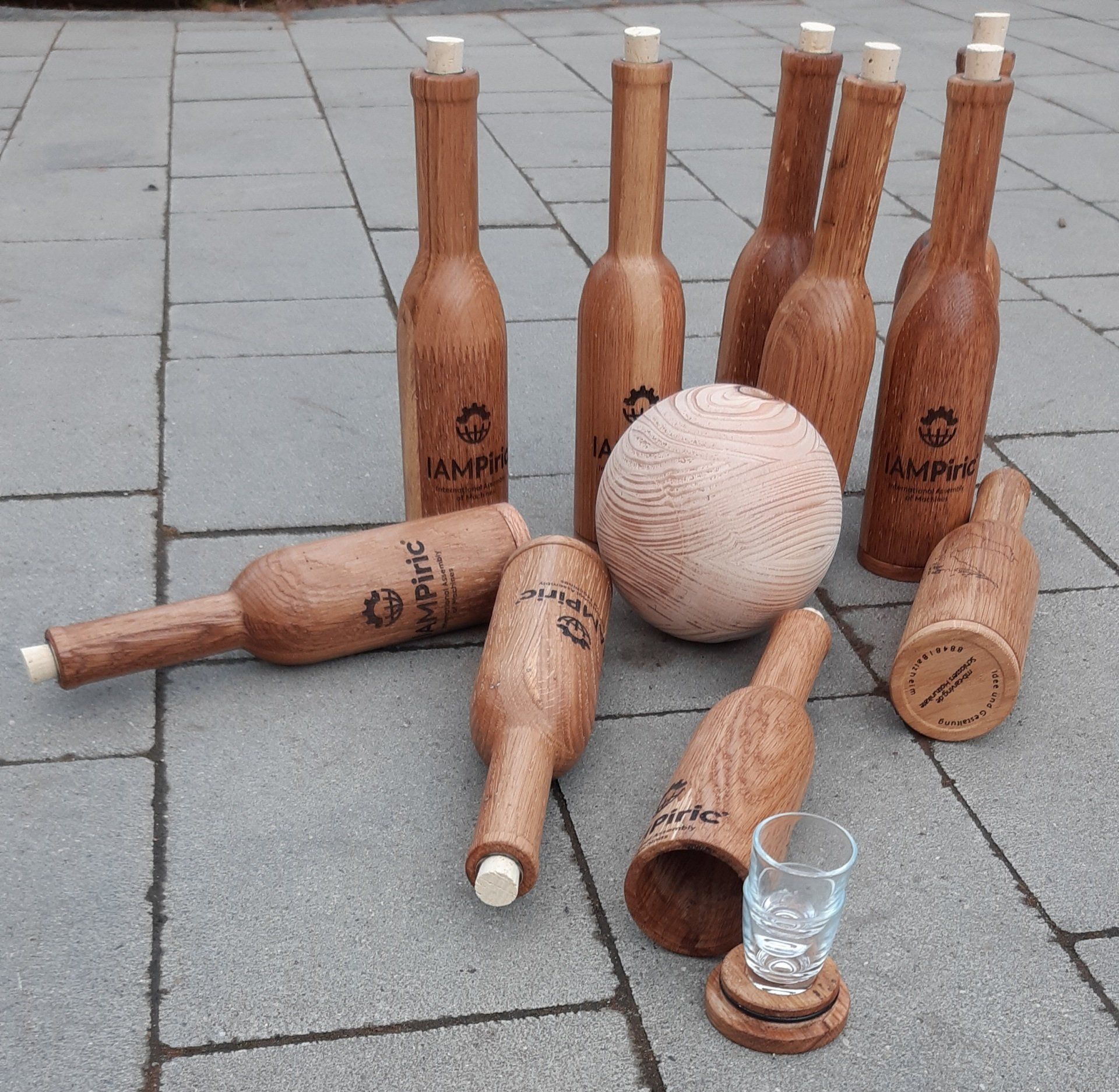 Die Holzflasche besteht aus dem hölzernen Körper und einem verschließbaren Glaskörper. Im abnehmbaren Flaschenboden befinden sich zwei Schnapsgläser.