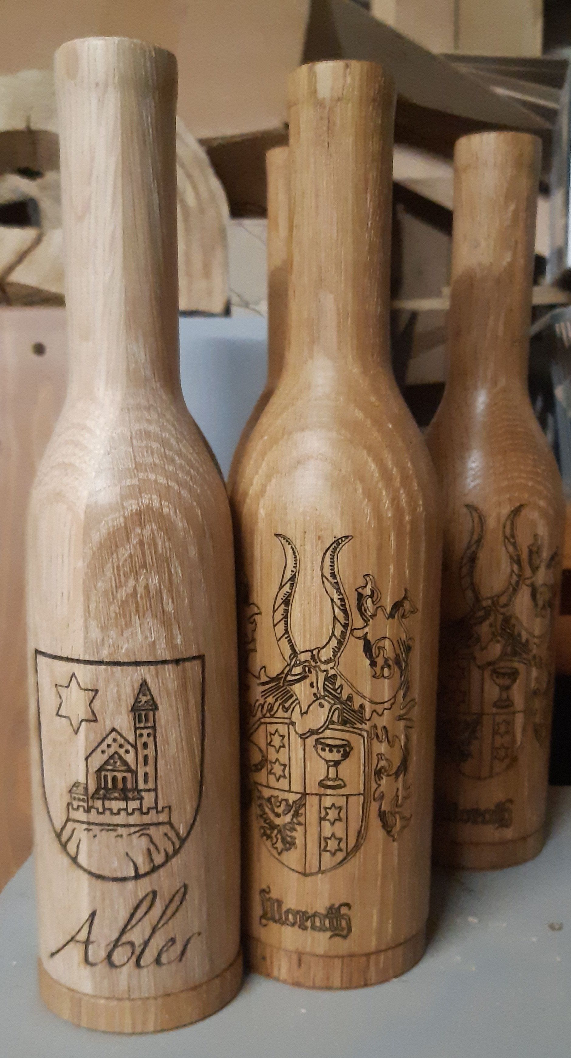 In Zusammenarbeit mit einem befreundeten, ortsansässigen Künstler entstehen diese Holzflaschen sowie Kugelschreiber, Füller und andere Schreibgeräte aus verschiedenen Hölzern.